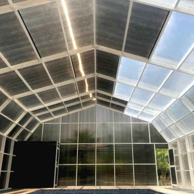 پوشش این سایبان ها را ورق های پلی کربنات تشکیل می دهند. پلی کربنات ماده ایست. سبک وزن و مقاوم. که می تواند علاوه بر فیلتر کردن اشعه ماوراء بنفش، در برابر ضربه و عوامل محیطی مانند برف، باران و باد مقاومت خوبی داشته باشد. یکی دیگر از ویژگی های پلی کربنات، شکل پذیری خوب و منعطف بودن آن است. که می تواند در طرح های مختلف بکار برده شود. این ماده در دو نوع شفاف و نیمه شفاف وجود دارد. که به شما امکان می دهد. با توجه به نیاز خود بخش هایی از پوشش سایبان استخر را نیمه شفاف سفارش دهید. که حریم خصوصی امنی را برای خود فراهم کنید.